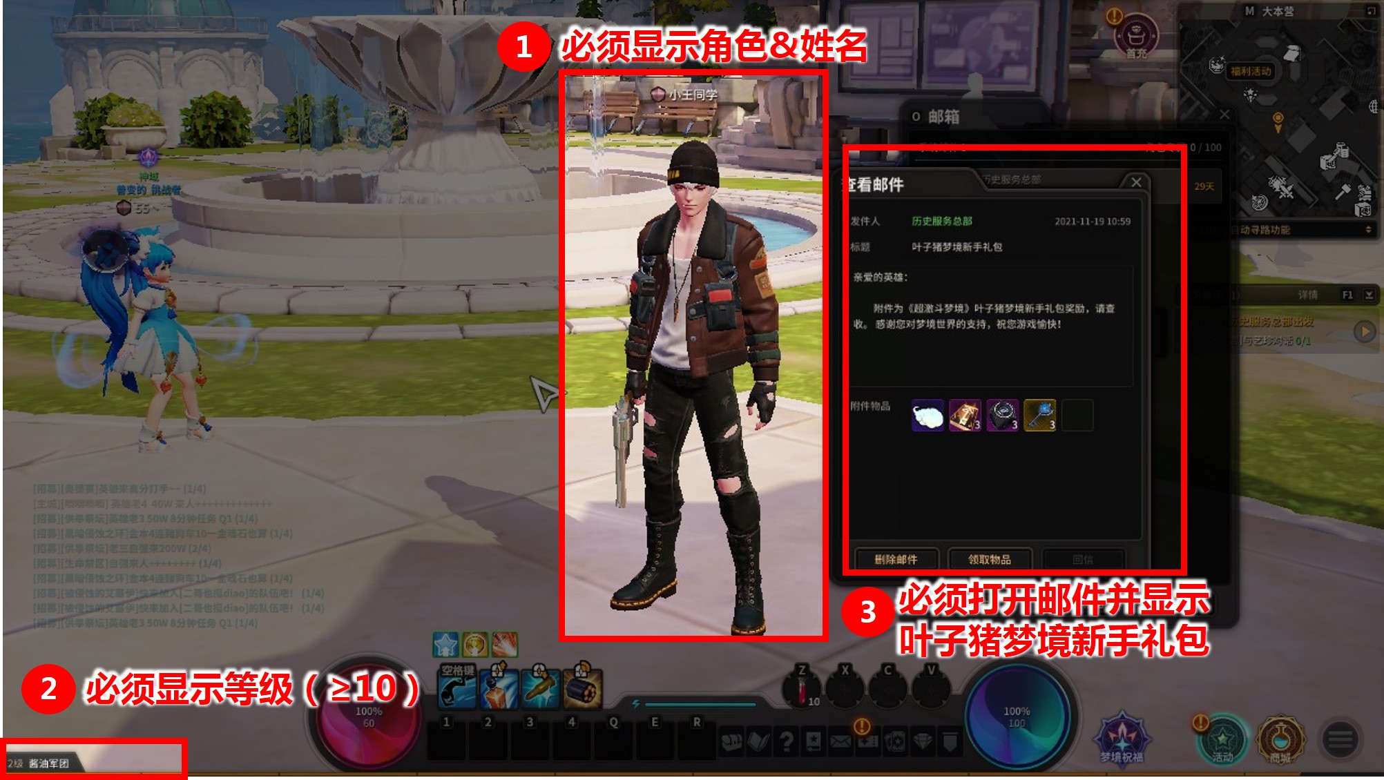 2、截圖必須包括角色、等級、禮包激活郵件;